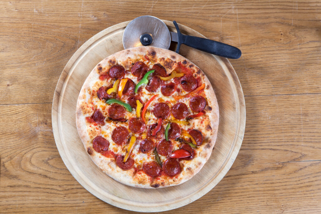 Pizza „christmas“ – Tomatensauce, Mozzarella, pikante Salami, Hokkaido-Kürbis, frische Feigen, Babyspinat, Gorgonzola € 17,50